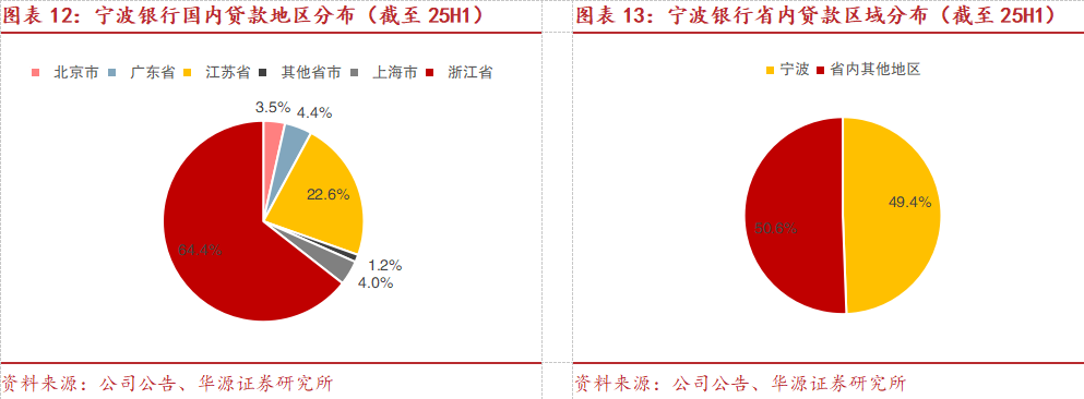 宁波银行贷款主要投向江浙沪。2025H1末宁波银行浙江省内贷款占公司贷款总额的64.4%,宁波市贷款占比为31.8%;同时,江苏省与上海市贷款占比分别为22.6%和4.0%,江浙沪贷款合计占比为90.9%;北京市和广东省贷款占比分别为3.5%和4.4%,珠三角及环渤海目前占比较低,未来发展空间或较大。