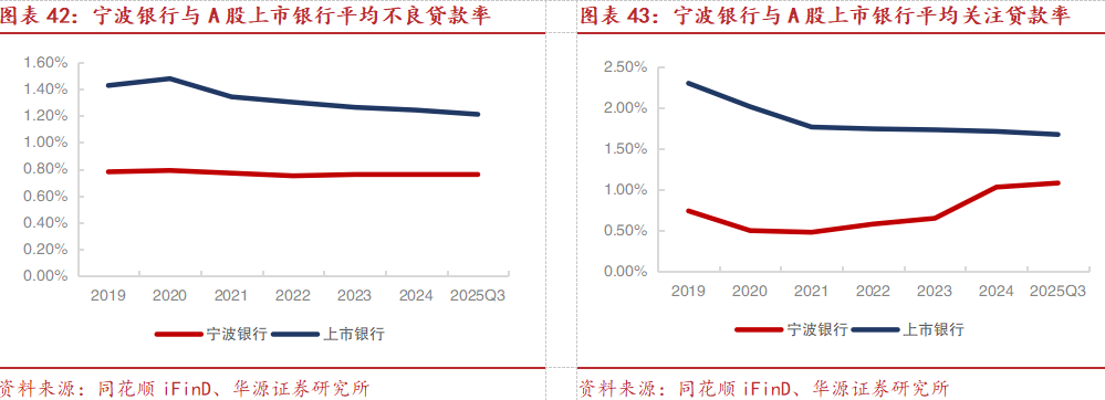 宁波银行不良贷款率与关注类贷款率均显著优于A股上市银行。公司不良贷款率长期稳定在低位,2019年末至2025Q3末维持在0.75%-0.79%区间,2025Q3末为0.76%,显著低于A股上市银行同期均值的1.21%,根据业绩快报,2025年末公司贷款不良率为0.76%;公司关注类贷款率也保持在低位,2019年末为0.74%,2021年末降至0.48%后小幅回升,2024年末/2025Q3末分别为1.03%/1.08%,仍明显低于A股上市银行同期均值的1.71%/1.67%。