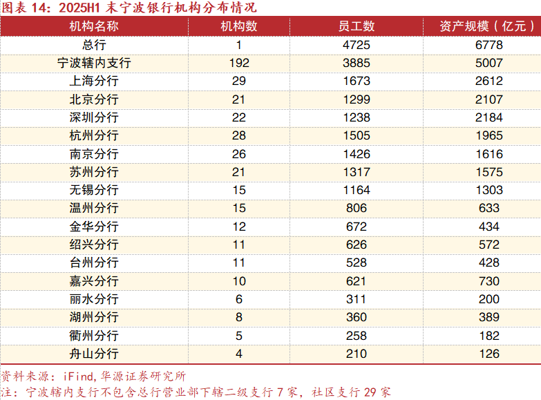 从机构布局看,宁波银行深耕省内,兼具江苏,外延北上深。2025H1末宁波银行已在浙江省11个地级市实现分行全覆盖,并在上海、深圳、北京等地拓展布局,合计拥有16家分行,机构数量达478个。从机构分布和资产规模来看,浙江省内分支机构数量为302家,占比为63.2%、资产规模为1.0万亿元,其中宁波市辖内一级支行192家(占机构数量比例为40.2%)、资产规模5007亿元。江苏省分支机构数量为62家(占机构数量比例为13.0%)、资产规模为4494亿元。上海/深圳/北京分别拥有29/22/21家分支机构,资产规模约2612/2184/2107亿元。