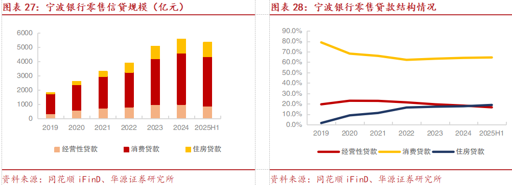宁波银行零售贷款以消费贷为主。宁波银行的零售贷款余额由2019年末的1797亿元快速增长至2024年末的5577亿元,2025H1末为5353亿元。消费贷受益于较早的布局,为零售贷款结构中占比最大的品类,2025H1末消费贷款余额3452亿元,占零售贷款总额的64.5%。