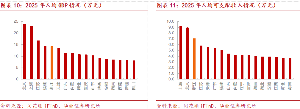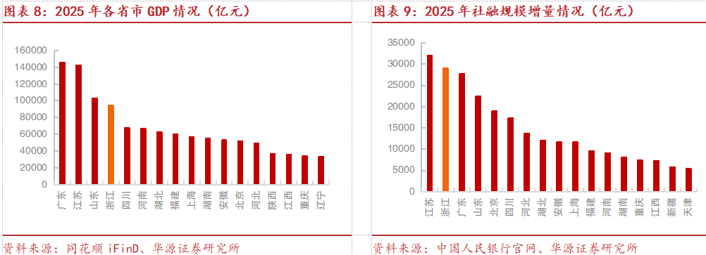长三角经济实力强,融资需求旺盛。2025年江苏与浙江人均GDP分别为16.7万元(全国第三)和14.2万元(全国第五),整体GDP及社融增量也长期稳居全国前列。浙江更是中国民营经济最为活跃的地区之一;在居民层面,浙江代表了全国“民富”区域之一。2025年人均可支配收入突破7.0万元,仅次于北京和上海,为全国各省第一。社融层面,2025年浙江省社融增量规模为2.9万亿元,位居全国第二,仅次于江苏,表明融资需求旺盛。