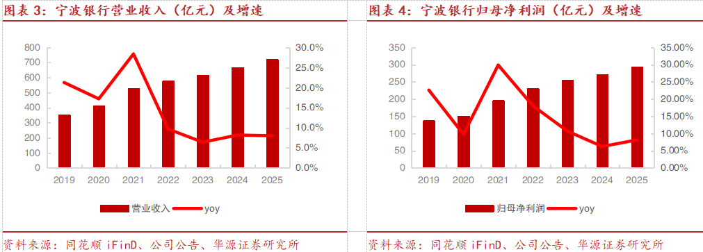 宁波银行近年业绩保持稳健增长。2019-2024年公司营业收入由351亿元提升至666亿元,5年复合增速约13.7%;归母净利润由137.14亿元增至271.27亿元,5年复合增速约14.6%。根据公司业绩快报,2025年公司营业收入/归母净利润分别为720/293亿元,同比+8.0%/+8.1%,延续稳健增长态势。对比同业来看,2023-2024年公司营收增速分别为+6.4%/+8.2%,显著高于上市银行均值-3.5%/+0.1%;归母净利润增速+10.66%/+6.23%也明显领先上市银行归母净利润增速均值+1.5%/+2.3%。
