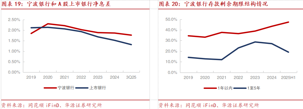 净息差领先,优势显著。3Q25宁波银行年化净息差为1.76%,显著高于A股上市银行均值的1.31%。2024年净息差为1.86%,同样显著高于A股上市银行均值的1.51%。公司存款期限管理良好,2025H1末公司1年以内到期存款占贷款总额的47.34%,较年初上升4.0pct;2025H1末1至5年内到期的存款占比较年初下降8pct,表明长期存款陆续进入重定价周期,有利于存款付息率下降,支撑息差企稳。同时,公司深耕中小微客户及消费贷,负债成本率较低,而资产收益率较高,对其净息差形成支撑。1H25公司计息负债成本率1.79%,生息资产收益率3.6%。