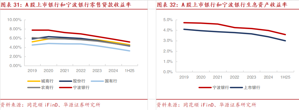 零售贷款收益率方面,宁波银行长期显著领先同业。2019-2023年宁波银行零售贷款收益率维持在6%以上,2024年为5.76%,1H25为5.15%,明显高于城商行/股份行/国有行/农商行同期的4.55%/4.28%/3.21%/4.37%,主要系宁波银行零售贷款结构中消费贷占比长期在六成以上,相较按揭等低收益品种,消费贷定价更高。