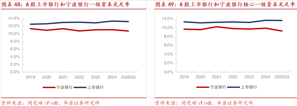 资产质量优异,资本充足率平稳。宁波银行坚持“经营银行就是经营风险”的风控理念,确保资产质量穿越周期。2025Q3末不良贷款率为0.76%,显著低于A股上市银行同期均值的1.21%。根据业绩快报,2025年末不良贷款率为0.76%。关注类贷款率也保持低位,2025Q3末为1.08%,明显低于A股上市银行同期均值的1.67%。2025H1末逾期贷款率为1.10%,低于A股上市银行同期的1.27%。根据业绩快报,2025年末拨备覆盖率为373%,安全垫充足;2025Q3末拨贷比为2.9%,与行业均值持平。2025年末核心一级资本充足率为9.3%,整体平稳,能够支撑业务发展。