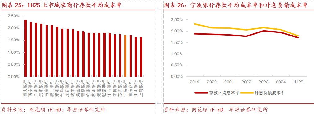依托对中小企业客群的强议价能力与完备的产品体系,宁波银行持续沉淀低成本存款,带动负债成本率下降。近年来公司存款平均成本率自2023年的高点2.01%逐步降至1H25的1.71%,在城农商行中处于偏低水平;同时计息负债成本率由2023年的2.15%降至1H25的1.79%,较2024年明显回落。