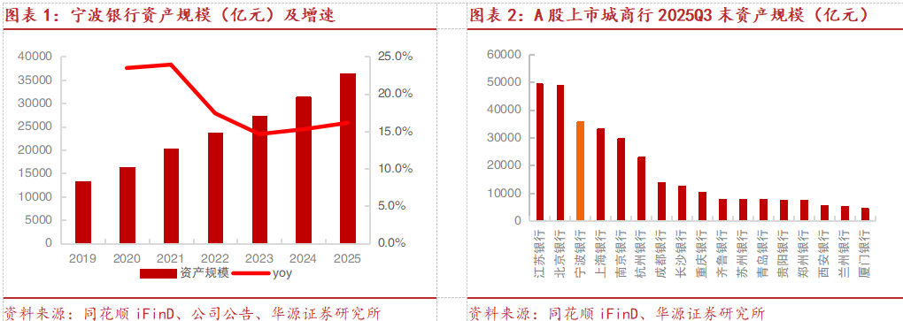 宁波银行资产规模增速较快。2019-2024年末宁波银行总资产由1.32万亿元提升至3.13万亿元,5年复合增速约18.9%;2025Q3末进一步增至约3.58万亿元(同比+16.6%)。对比来看,在上市城商行中宁波银行资产规模处于第一梯队,2025Q3末仅次于江苏银行、北京银行,高于上海银行、南京银行等,体现其在长三角深耕基础上的持续扩表能力。