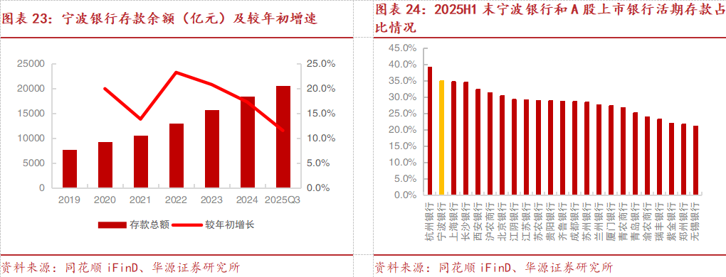 凭借清晰的目标客户定位,宁波银行存款规模近年持续扩张。2019至2024年末公司存款规模复合增速达18.9%,2025Q3末存款规模2万亿元,较年初增长11.5%,增长态势良好。活期占比方面,2025H1末宁波银行活期存款占存款总额的35.1%,在城商行中属于第一梯队,略低于杭州银行(39.3%),与上海银行(34.7%)和长沙银行(34.6%)接近,明显高于多数同业(如江苏银行29.3%、苏州银行28.5%、南京银行20.6%)。宁波银行较高的活期存款占比更有利于成本控制,为较低的计息负债成本率奠定基础。