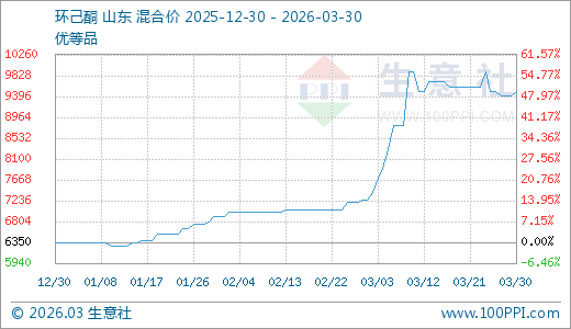 环己酮03月30日最新价格9500.00元/吨,最近30天上涨31.03%,60天上涨39.71%,90天上涨49.61%。
