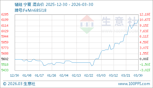 据生意社监测,锰硅03月30日最新价格6214.00元/吨,最近10天上涨3.95%,20天上涨7.99%,30天上涨10.77%,60天上涨11.88%。