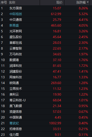 算力租赁概念局部异动,算力调度方向领涨,思特奇、直真科技涨停,东方国信、光环新网、中贝通信、优刻得等跟涨。