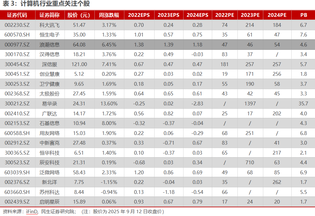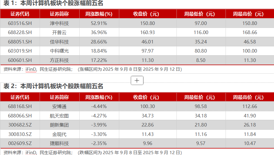 本周(9.8-9.12)沪深300指数上涨1.38%,中小板指数上涨3.66%,创业板指数上涨2.10%,计算机(中信)板块上涨4.26%。板块个股涨幅前五名分别为:淳中科技、开普云、佳华科技、中科曙光、方正科技;跌幅前五名分别为:安博通、航天宏图、朗新集团、金现代、捷顺科技。