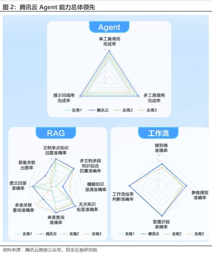 腾讯Agent能力总体领先,未来或成为重点发力方向。据腾讯云微信公众号,基于行业首创的全局Agent能力,腾讯云工作流会提前规划好工序(节点),遇到问题(如用户修改信息)能自动“倒带”到对应节点修正,避免从头再来。在2025年年4月平台就支持MCP协议,用户可以通过平台调用MCP插件或插入自定义 MCP 插件,帮助开发者最快5分钟搭一个专属AI助手。目前腾讯云智能体开发平台已经在游戏、零售、金融等行业“上岗”,帮企业快速生产属于自己的AI助手,并结合腾讯云的云计算、安全能力在国内外多场景扩展使用可能性。