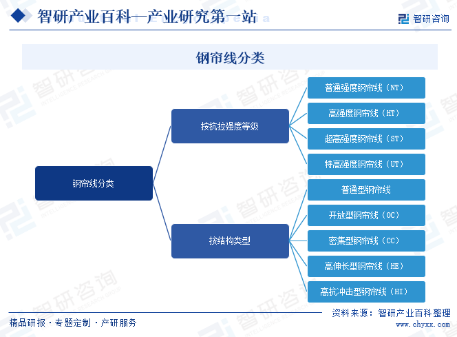 《子午线轮胎用钢帘线》(GB/T11181—2016)及《工程子午线轮胎用钢帘线》(GB/T30830—2014)将子午线轮胎及工程子午线轮胎用钢帘线按抗拉强度等级分为普通强度钢帘线(NT)、高强度钢帘线(HT)、超高强度钢帘线(ST)、特高强度钢帘线(UT)四种类型。《子午线轮胎用钢帘线》(GB/T11181—2016)又按结构类型将钢帘线分为普通型钢帘线、开放型钢帘线(OC)、密集型钢帘线(CC)、高伸长型钢帘线(HE)和高抗冲击型钢帘线(HI)五种。