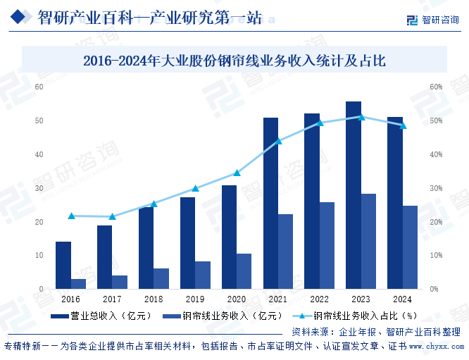 山东大业股份有限公司主营业务为胎圈钢丝、钢帘线以及胶管钢丝的研发、生产和销售,产品主要应用于乘用车轮胎、载重轮胎、工程轮胎以及航空轮胎等各种轮胎制品和其他橡胶制品。公司现有主要国内客户有中策橡胶、玲珑轮胎、赛轮轮胎、风神股份、森麒麟、恒丰橡塑、华盛橡胶、昊华轮胎、佳通轮胎等规模较大、行业内知名度较高的轮胎制造商;主要国际客户有米其林、普利司通、固特异、德国大陆、住友橡胶、韩泰轮胎、倍耐力等国际知名轮胎生产商。2024年大业股份营业总收入完成50.97亿元,其中,钢帘线业务收入24.75亿元,占营业总收入的48.56%。