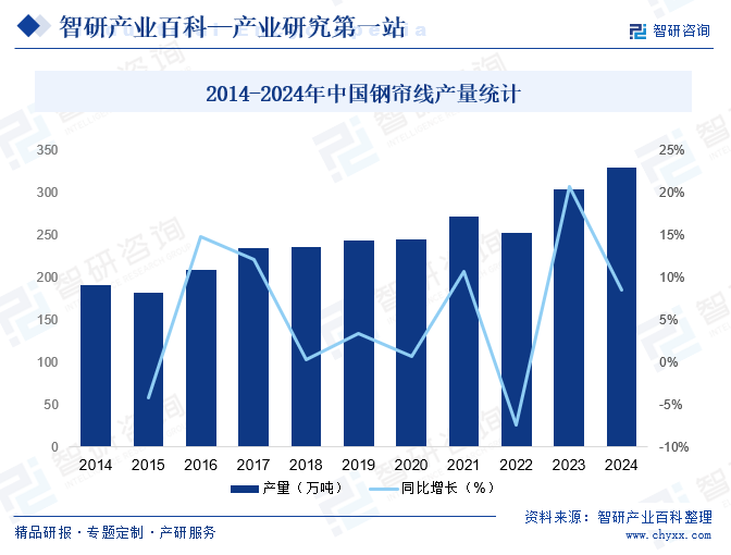 我国钢帘线的需求量与轮胎结构品种的产量密切相关,近年来在经济刺激政策、工程机械、汽车工业、高速公路等有利因素的推动下,我国轮胎工业取得了快速发展,钢帘线也随着轮胎市场的繁荣而发展壮大,近年来,国内钢帘线逐渐转变了供不应求的局面,产品的产量和质量皆已达到国内轮胎市场的要求,国内市场已逐渐摆脱了对进口产品的依赖。据统计,2024年我国钢帘线产量达330.48万吨,同比增长8.53%。