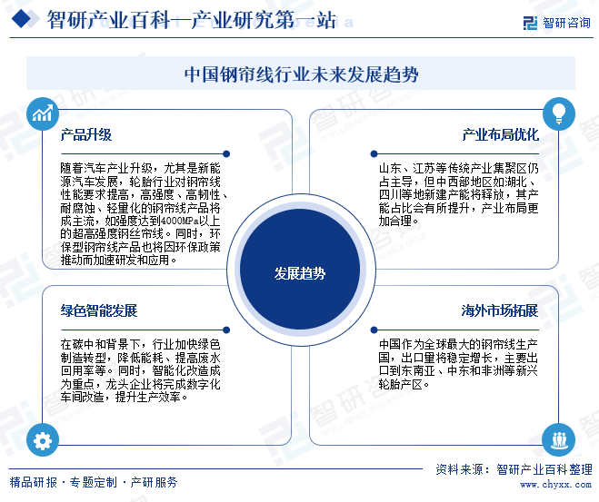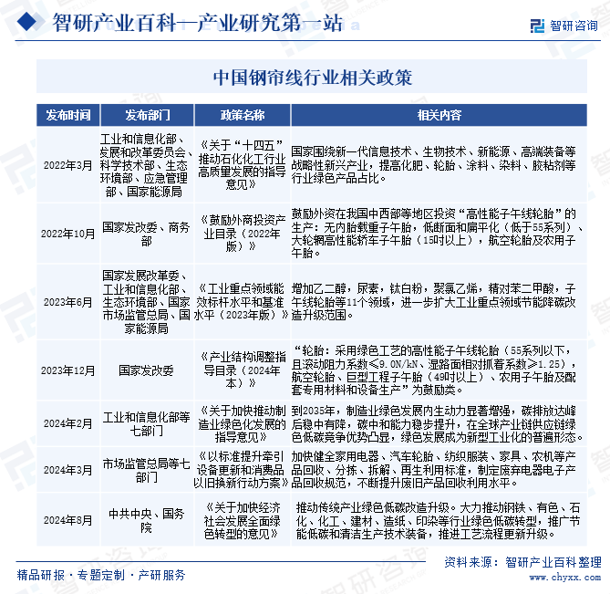 钢帘线是金属线材制品中的皇冠产品,对我国子午轮胎的发展尤为重要,近年来,我国高度重视钢帘线产业发展,相继发布《关于“十四五”推动石化化工行业高质量发展的指导意见》《鼓励外商投资产业目录(2022年版)》《工业重点领域能效标杆水平和基准水平(2023年版)》《产业结构调整指导目录(2024年本)》《关于加快推动制造业绿色化发展的指导意见》《以标准提升牵引设备更新和消费品以旧换新行动方案》《关于加快经济社会发展全面绿色转型的意见》等一系列推动行业往绿色、高质量方向发展。