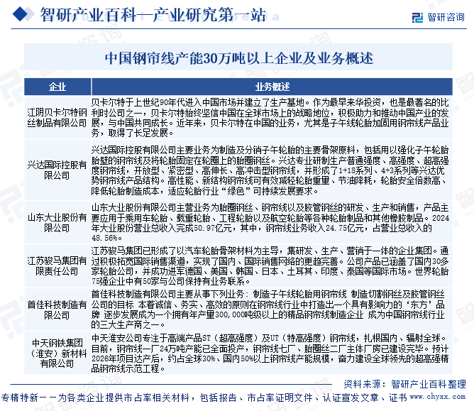 我国钢帘线行业集中度保持高位,2024年钢帘线产能30万吨以上企业有贝卡尔特(中国)、江苏兴达、大业股份、江苏骏马、首佳科技和中天(淮安)五家,其中,钢帘线龙头企业江苏兴达主营产品市场占有率达到1/3以上,行业集中度进一步提高。
