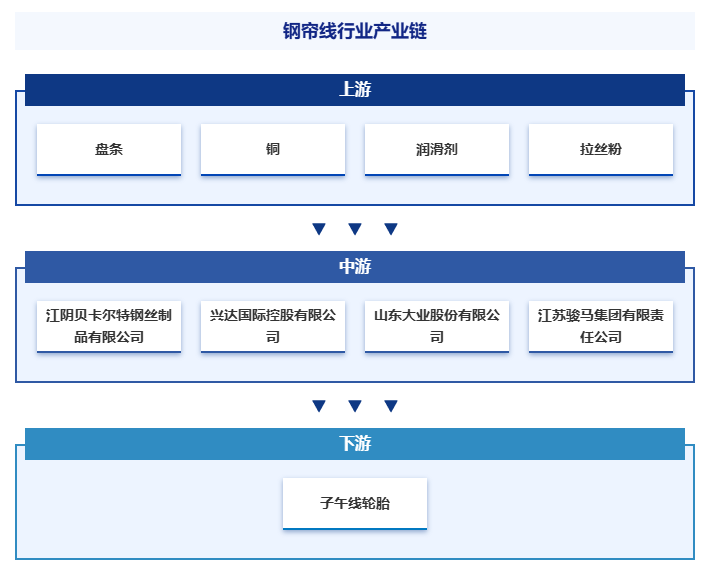 钢帘线行业上游主要包括盘条、铜、润滑剂、拉丝粉等原材料供应商以及拉丝机、捻股机、镀铜设备、热处理设备等生产设备供应商,其中,盘条是钢帘线生产的基础原料,钢铁企业通过炼钢、连铸、轧制等工艺生产出符合要求的盘条,供应给钢帘线生产企业,如宝钢、鞍钢等大型钢铁企业是钢帘线盘条的重要供应商。行业下游为应用市场,主要用于子午线轮胎的生产,据中国橡胶工业协会轮胎分会统计和调查,轮胎37家重点会员企业2024年度实现现价工业总产值2635.63亿元,同比增长10.22%;实现销售收入2655.95亿元,增长6.64%;综合外胎产量73915万条,增长12.97%;其中子午线轮胎产量71399万条,增长13.27%;全钢子午线轮胎产量13870万条,增长2.68%;子午化率96.60%,增加0.26个百分点。我国子午线轮胎稳步增产为钢帘线行业发展带来广阔的增长空间。