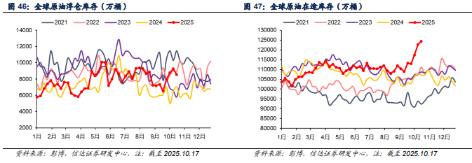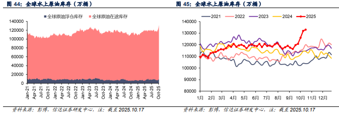 截至2025年10月17日当周,全球原油水上库存(包括在途和浮仓)为13.30亿桶,较上周+1007.9万桶(+0.76%)。其中,全球原油浮仓库存为8554.4万桶,较上周-692.1万桶(-8.09%);全球原油在途库存为12.44亿桶,较上周+1700万桶(+1.37%)。