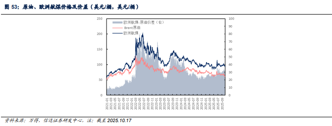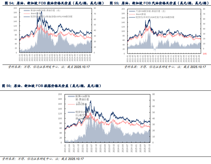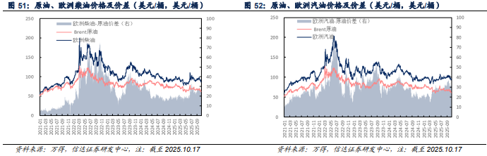 欧洲市场:截至2025年10月17日当周,欧洲柴油、汽油、航煤周均价分别为88.75(-2.42)、94.59(-1.64)、94.59(-2.16)美元/桶;与原油差价分别为26.37(+0.36)、32.22(+1.14)、32.22(+0.62)美元/桶。