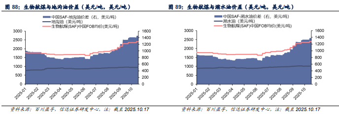 生物航煤价格及价差:截至2025年10月17日,中国生物航煤港口FOB价格为2400美元/吨,较上周五价格+50美元/吨,与地沟油、潲水油价差分别为1456.79、1379.55美元/吨,较上周五价差分别+48.69、+48.58美元/吨。欧洲生物航煤港口FOB价格为2710美元/吨,较上周五价格-20美元/吨。