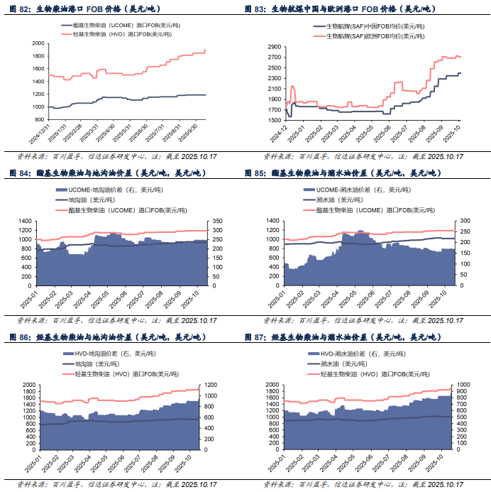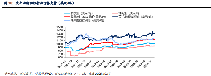 原料油价格:截至2025年10月17日,中国地沟油、潲水油价格分别为943.21、1020.45美元/吨,较上周五价格分别+1.31、+1.42美元/吨,中国餐厨废油UCO价格为1135美元/吨,较上周五价格持平。