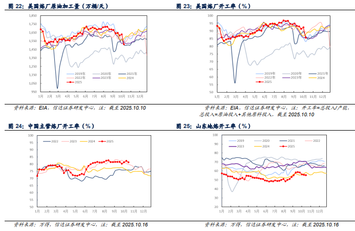 中国炼厂:截至2025年10月16日,主营炼厂开工率为81.23%,较上周下降1.03pct。截至2025年10月15日,山东地炼开工率为55.34%,较上周下降0.47pct。