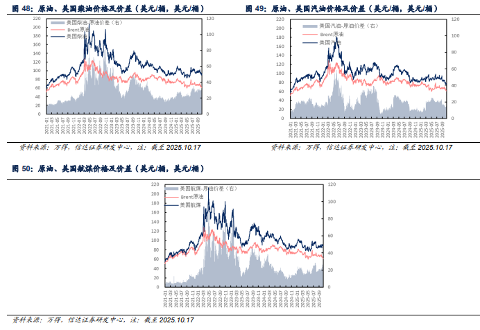 原油价差:截至2025年10月17日当周,布伦特-WTI期货价差为4.14美元/桶,较上周扩大0.31美元/桶;布伦特现货-期货价差为-0.21美元/桶,较上周收窄2.53美元/桶;布伦特-俄罗斯Urals价差为-4.2美元/桶,较上周收窄1.44美元/桶;WTI-俄罗斯Urals价差为-8.34美元/桶,较上周收窄1.75美元/桶;布伦特-俄罗斯ESPO价差为0.86美元/桶,较上周收窄1.97美元/桶;WTI-俄罗斯ESPO价差为-3.28美元/桶,较上周收窄2.28美元/桶。