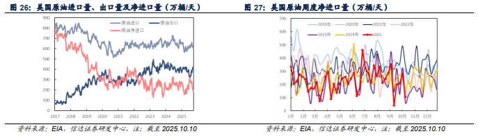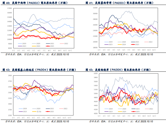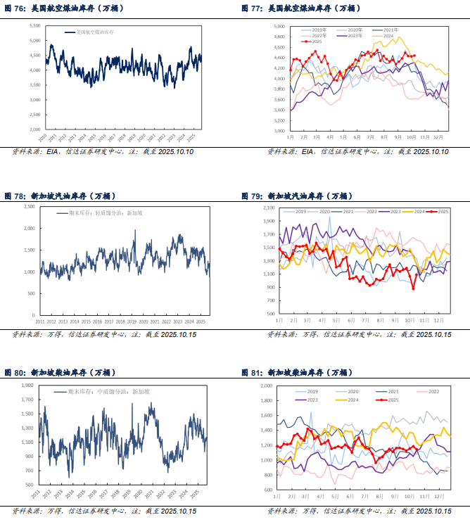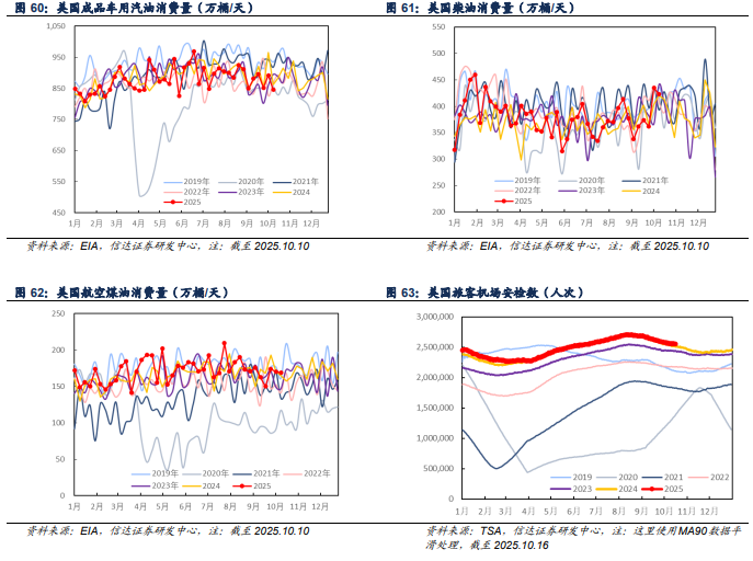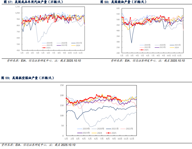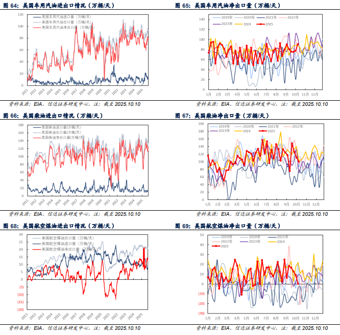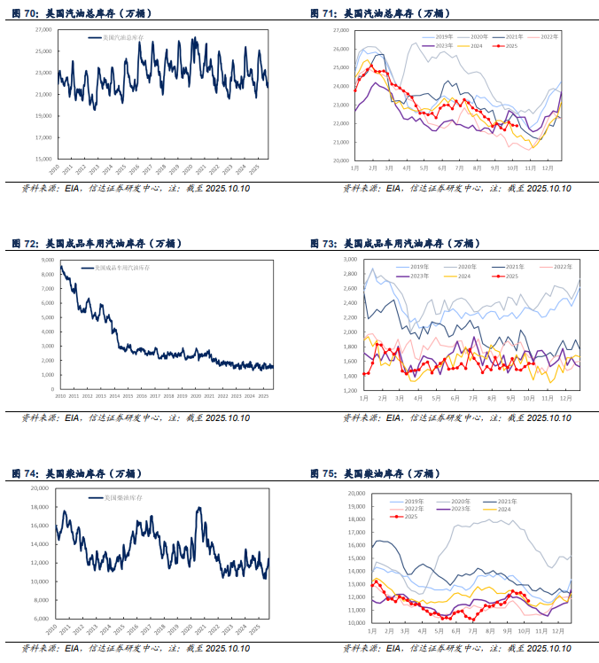 产量方面:截至2025年10月10日当周,美国成品车用汽油、柴油、航空煤油产量分别为935.9、459.2、171.5万桶/天,较上周分别-39.4(-4.04%)、-57.7(-11.16%)、-6.6(-3.71%)万桶/天。