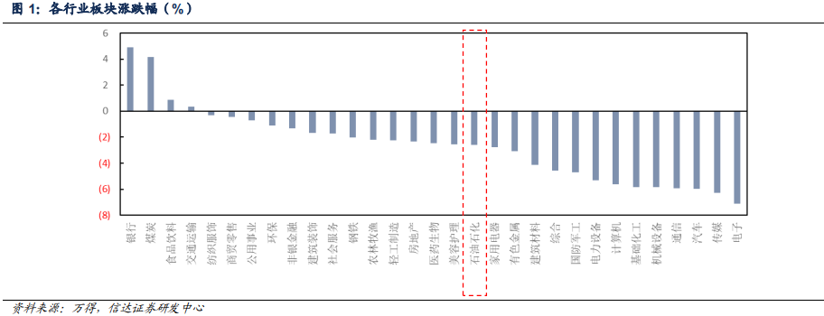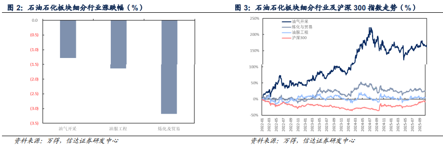 截至2025年10月17日当周,油气开采板块下跌1.28%,油服工程板块下跌1.64%,炼化及贸易板块下跌3.18%。