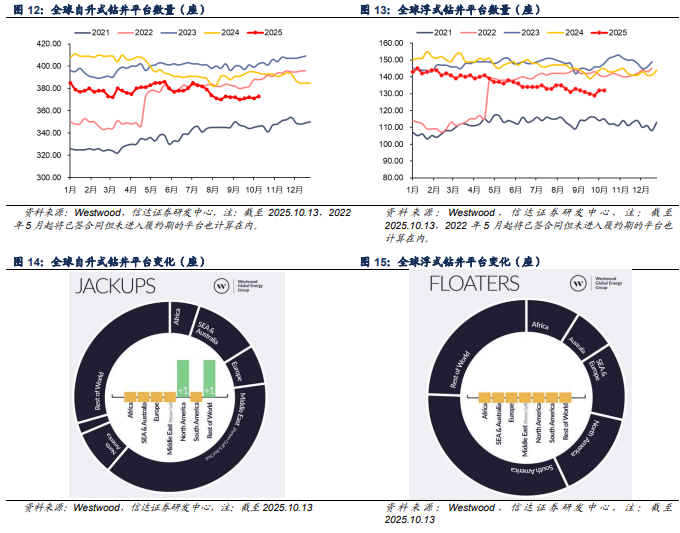 已有合同的钻井平台数量:截至2025年10月13日当周,全球海上自升式钻井平台数量为373座,较上周增加2座,其中北美、其他地区各增加1座;全球海上浮式钻井平台数量为132座,较上周持平。