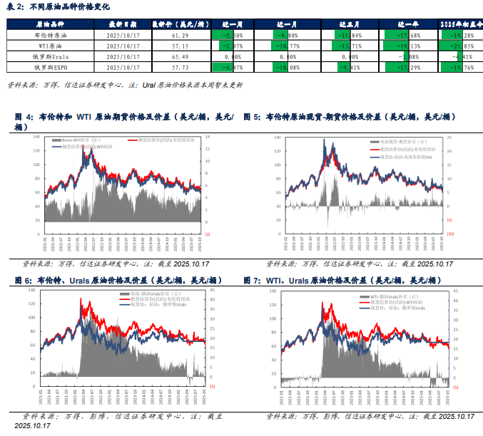 原油价格:截至2025年10月17日当周,布伦特原油期货结算价为61.29美元/桶,较上周下降1.44美元/桶(-2.30%);WTI原油期货结算价为57.15美元/桶,较上周下降1.75美元/桶(-2.97%);俄罗斯Urals原油现货价为65.49美元/桶,与上周持平;俄罗斯ESPO原油现货价为57.73美元/桶,较上周下降2.70美元/桶(-4.47%)。