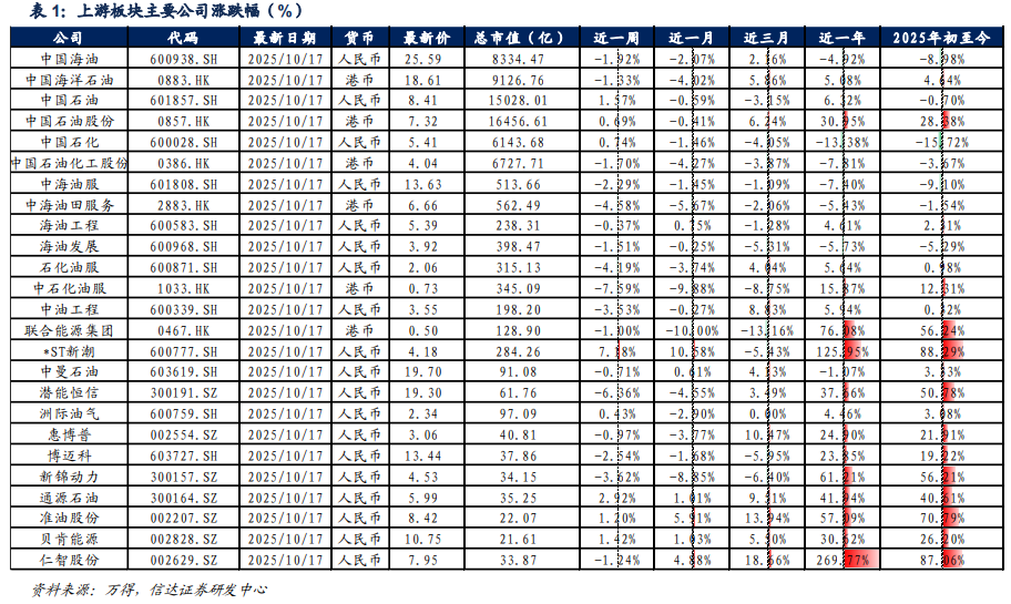 截至2025年10月17日当周,上游板块股价表现较好的是ST新潮(+7.18%)、通源石油(+2.92%)、贝肯能源(+1.42%)。