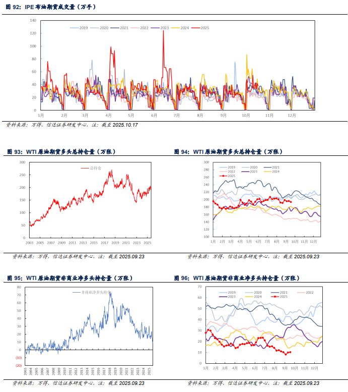 原油期货成交及持仓:截至2025年10月17日,周内布伦特原油期货成交量为258.94万手,较上周增加17.63万手(+7.31%)。截止至2025年09月23日,周内WTI原油期货多头总持仓量为193.67万张,较上周减少2.59万张(-1.32%);非商业(投机和套利目的持有)净多头持仓10.3万张,较上周增加0.42万张(+4.30%)。