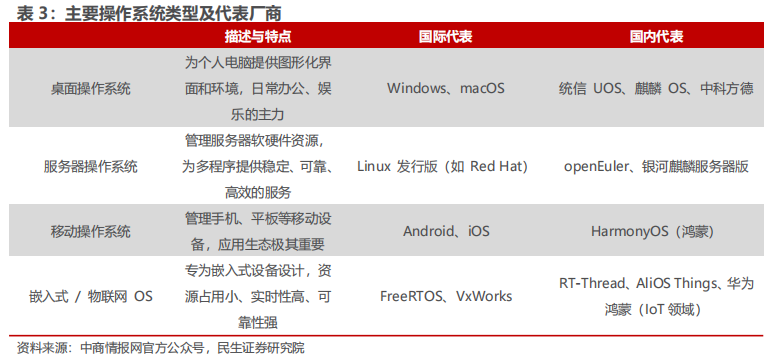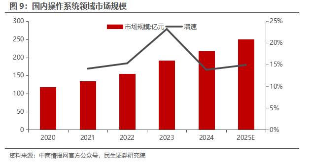 操作系统:国内操作系统行业持续发展。根据中商产业研究院的数据,2024年中国操作系统市场规模达到217.5亿元,较上年增长13.8%,2025年中国操作系统市场规模将有望达到250亿元。