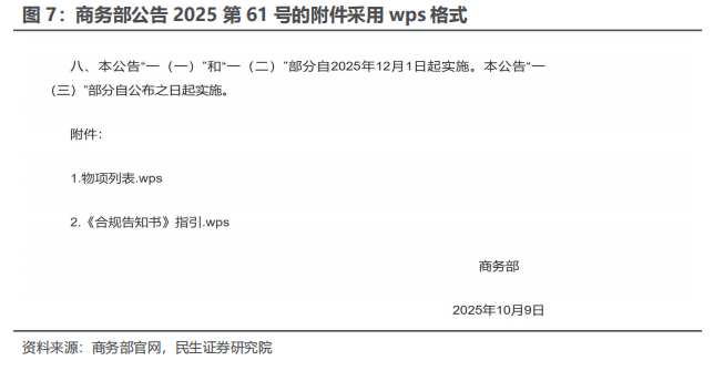 政策大力支持国产化,信创不断加速。1)2025年9月30日,国务院办公厅印发《关于在政府采购中实施本国产品标准及相关政策的通知》。政策明确指出,政府采购活动中既有本国产品又有非本国产品参与竞争的,依法对本国产品给予价格评审优惠,对本国产品的报价给予20%的价格扣除,用扣除后的价格参与评审。2) 10月9日,商务部发布2025年第61号公告,对含有中国成分的部分境外稀土相关物项实施出口管制。该公告的附件,物项列表、与《合规告知书》指引,全部采用金山办公软件WPS格式。
