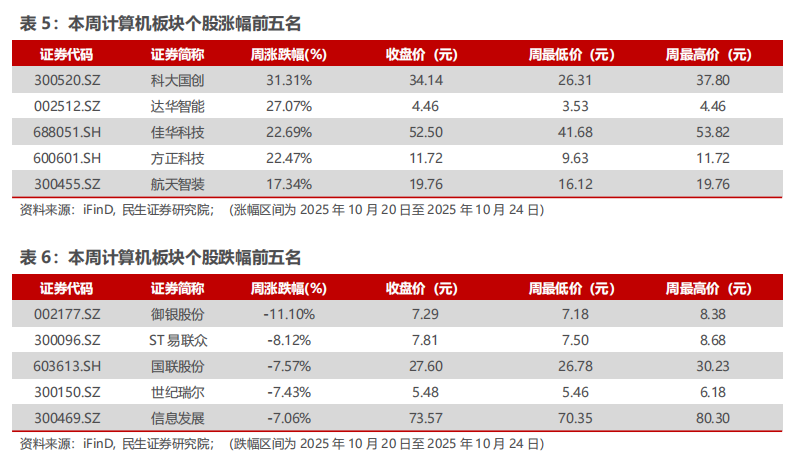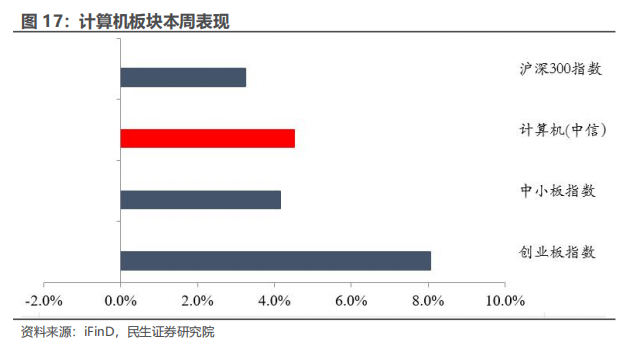 本周(10.20-10.24)沪深300指数上涨3.24%,中小板指数上涨4.15%,创业板指数上涨8.05%,计算机(中信)板块上涨4.52%。板块个股涨幅前五名分别为:科大国创、达华智能(维权)、佳华科技、方正科技、航天智装;跌幅前五名分别为:御银股份、ST易联众(维权)、国联股份(维权)、世纪瑞尔、信息发展。