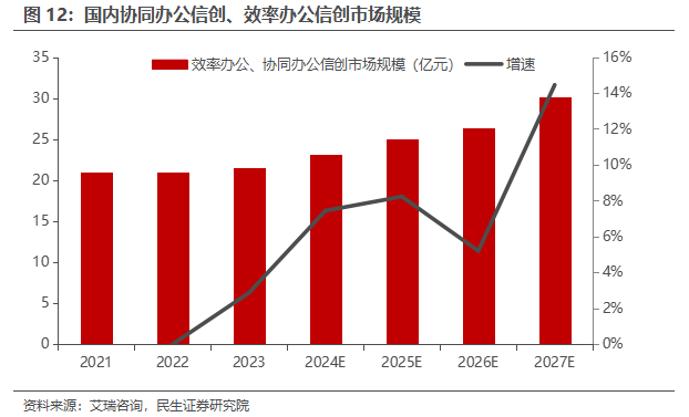 办公软件:国内办公软件市场保持稳步增长。1)受央国企信创等因素驱动,协同办公信创、效率办公信创市场有望保持稳步发展。根据艾瑞咨询数据,协同办公信创、效率办公信创市场在2027年有望总计达到30.1亿元。2)作为办公软件龙头,金山办公积极发力信创市场。金山办公参与中央及地方政企用户国产办公软件招标。2025H1,公司产品在流式及版式文档市场的占有率继续保持领先地位。公司积极参与政府数字平台及AI项目建设:多地一网协同、共享文档库等平台选择公司核心产品;公司政务版AI赋能多地政府智能化升级。公司政务AI持续迭代,针对公文写作场景,完善政务物料库,并进行多场景细化训练,新增公文类型识别、公文附件搜索等功能,并增强事实核查等 AI 应用准确率。