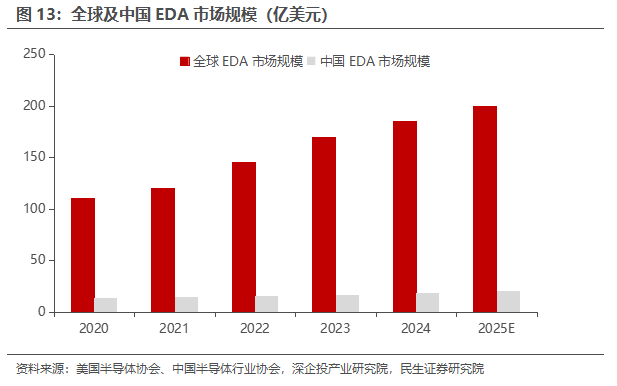 EDA:EDA行业作为集成电路产业的战略基础支柱,近年来在政策支持、市场需求和技术突破的多重驱动下,展现出快速发展的态势。国产EDA企业在产业生态构建中发挥着愈发关键的作用,在模拟电路、数字电路设计等领域取得诸多技术突破。根据《深企投产业研究2025年行业研究报告》、美国半导体协会、中国半导体行业协会数据,全球EDA工具市场规模从2020年110亿美元增至 2024年的185亿美元,预计2025年达到200亿美元;国内市场规模从2020年的13.7亿美元增加值至2024年的18.6亿美元,预计2025年达20.5亿美元。