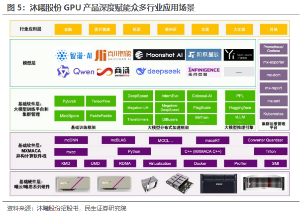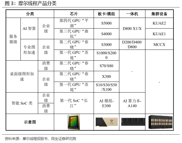 摩尔线程:公司主要从事GPU 及相关产品的研发、设计和销售。自 2020 年成立以来,公司以自主研发的全功能 GPU 为核心,致力于为 AI、数字孪生、科学计算等高性能计算领域提供计算加速平台。公司已成功推出四代 GPU 架构,并形成了覆盖 AI 智算、高性能计算、图形渲染、计算虚拟化、智能媒体和面向个人娱乐与生产力工具等应用领域的多元计算加速产品矩阵,产品线涵盖政务与企业级智能计算、数据中心及消费级终端市场,能够满足政府、企业和个人消费者等在不同市场中的差异化需求。