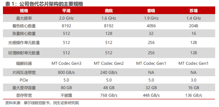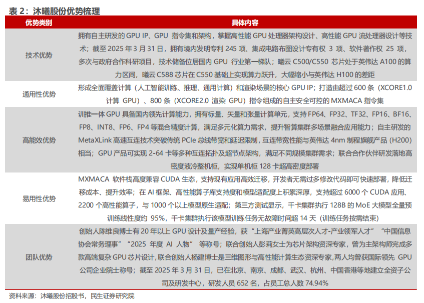 2)通用性优势:已形成了全面覆盖计算和渲染场景的核心GPU IP,打造了由超过600条(XCORE1.0 计算 GPU)、800条(XCORE2.0 渲染 GPU)指令组成自主安全可控的 MXMACA 指令集。
