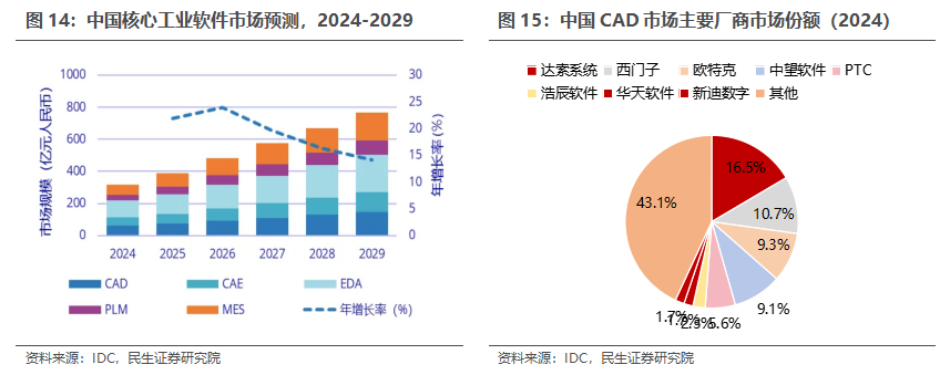 CAD:工业设计领域国产化力量正蓬勃发展。根据IDC数据,中国核心工业软件市场(含CAD、CAE、EDA、PLM、MES等,不含咨询和实施服务)规模将从2024年的318.6亿元增长到2029年的765亿元,五年复合增速约为19.1%。在CAD市场,2024年国内厂商CAD市场占比快速提升,达到27%左右的市场占有率,与上年相比提升2%。到2029 年,国内CAD市场规模有望增长到146.8亿元人民币。