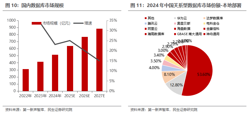 数据库:国内数据库产业保持快速发展态势。根据第一新声智库数据,2024年国内数据库市场规模为512亿元,2022年-2027年复合增长率为23.21%。在2024年国内关系型数据库市场份额中,本地部署数据库市场CR10占比约45%,华为云、达梦数据库、电科金仓等公司份额相对领先。