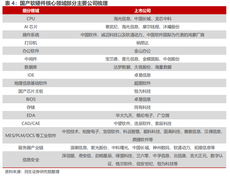 在此,我们对国产软件、硬件领域重要环节的部分核心标的进行梳理。