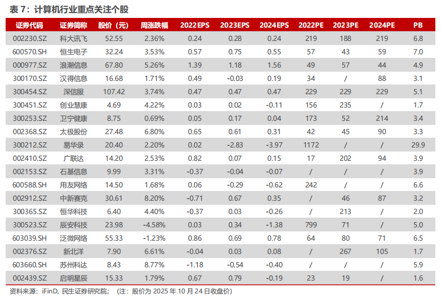 信创:1)国产基础软硬件龙头:中国软件、达梦数据、中国长城、寒武纪、海光信息、太极股份等。2)信创细分领域龙头:金山办公、卓易信息、纳思达、海量数据、超图软件、彩讯股份、航天软件等。3)工业软件:概伦电子、华大九天、广立微、中望软件、浩辰软件、索辰科技、中控技术、柏楚电子、宝信软件、科远智慧、能科科技、固高科技、赛意信息、汉得信息、鼎捷软件等。4)鸿蒙:软通动力、中国软件国际、拓维信息、润和软件、诚迈科技、麒麟信安、东方中科等。