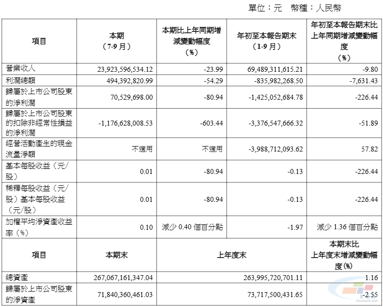 10月30日晚,金隅集团发布三季度业绩报告。