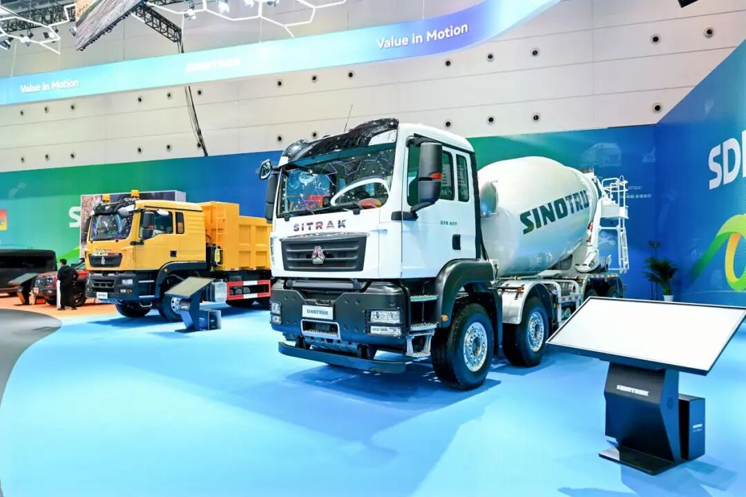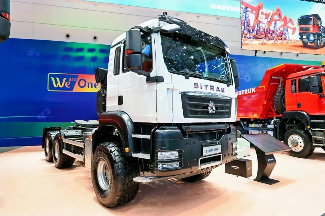 在特种作业展区,汕德卡6×6全驱牵引车、豪沃TX全驱自卸车同样引人注目,展示了中国重汽作为全品类供应商的综合实力。