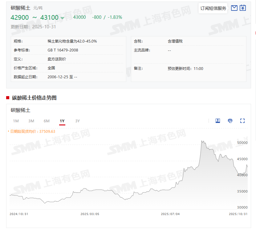 碳酸稀土今年9月30日的均价为45550元/吨,与其2024年12月31日的均价32250元/吨相比,上涨了13300元/吨,涨幅为41.24%。