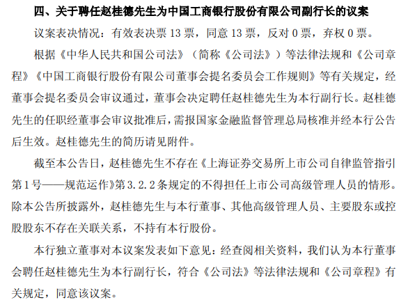 10月30日,工行发布公告称,决定聘任赵桂德为副行长。
